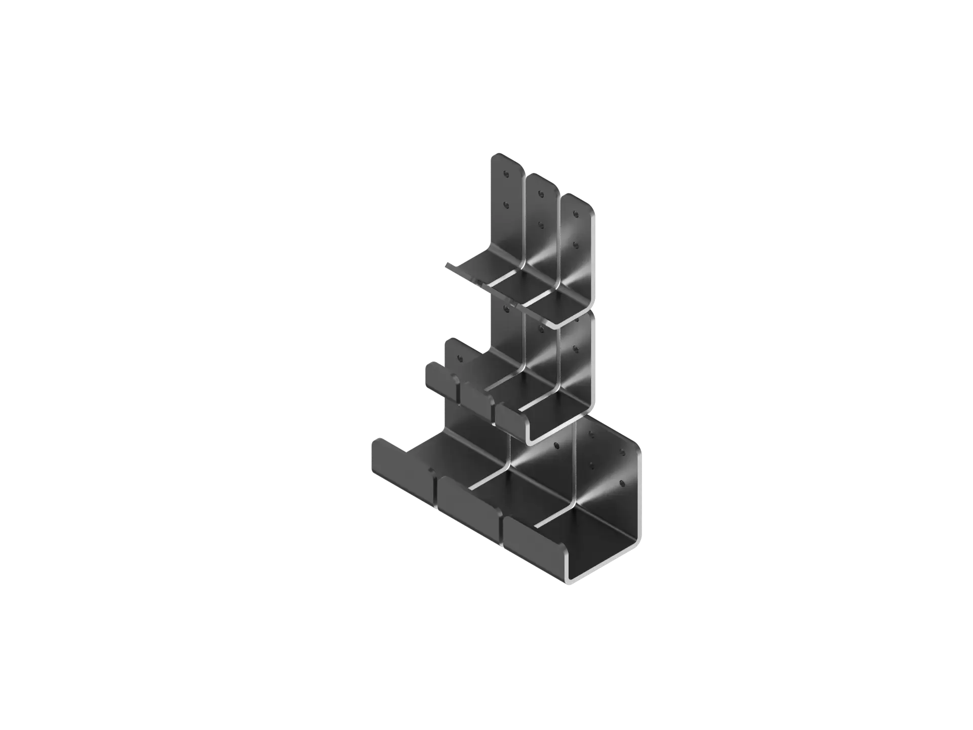 Each hook is laser-cut and bent from A36 steel with an industrial raw-steel finish. The Mini Hooks handle compact, high-density layouts, the Retainer Hooks provide extended reach and improved retention, and the HD Hooks deliver maximum rigidity and load surface for heavier items.